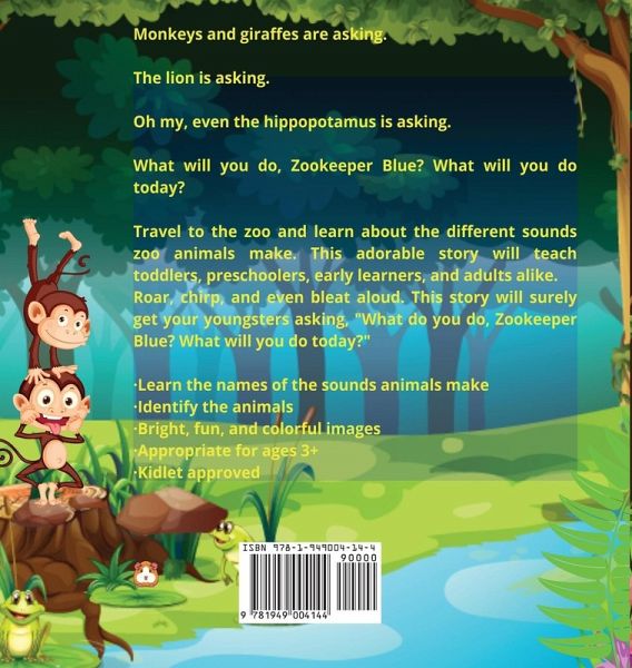 USA Today bestselling author Tina Glasneck's picture book debut created for her storytime and kid-approved! Monkeys and giraffes are asking. The lion is asking. Oh my, even the hippopotamus is asking. What will you do, Zookeeper Blue? What will you do today? Travel to the zoo and learn about the different sounds zoo animals make. This adorable story will teach toddlers, preschoolers, early learners, and adults alike. Roar, chirp, and even bleat aloud. This story will surely get your youngsters asking, "What do you do, Zookeeper Blue? What will you do today?" * Learn the names of the sounds animals make * Identify the different animals * Bright, fun, and colorful images * Appropriate for ages 3+ * Kidlet approved