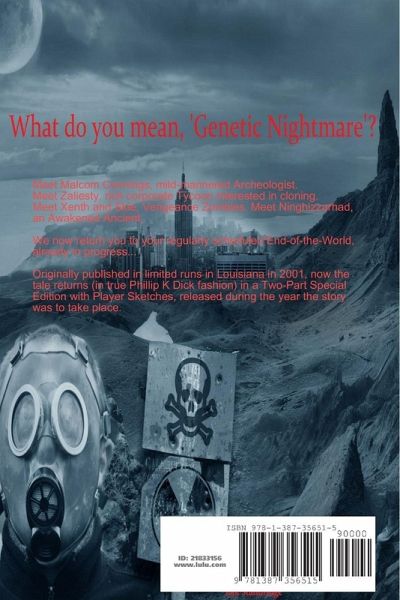 Meet Malcom Connings, mild-mannered Archeologist. Meet Zaliesty, rich corporate Tycoon interested in cloning. Meet Xenth and Skie, Vengeance Zombies. Meet Ninghizzarhad, an Awakened Ancient. We now return you to your regularly scheduled End-of-the-World, already in progress... Originally published in limited runs in Louisiana in 2001, now the tale returns (in true Phillip K Dick fashion) in a Two-Part Special Edition with Player Sketches, released during the year the story was to take place.