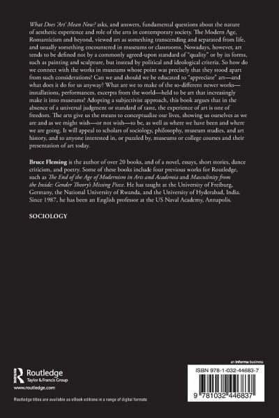 What Does 'Art' Mean Now? asks, and answers, fundamental questions about the nature of aesthetic experience and role of the arts in contemporary society. The Modern Age, Romanticism and beyond, viewed art as something transcending and separated from life, and usually something encountered in museums or classrooms. Nowadays, however, art tends to be defined not by a commonly agreed-upon standard of "quality" or by its forms, such as painting and sculpture, but instead by political and ideological criteria. So how do we connect with the works in museums whose point was precisely that they stood apart from such considerations? Can we and should we be educated to "appreciate" art-and what does it do for us anyway? What are we to make of the so-different newer works-installations, performances, excerpts from the world-held to be art that increasingly make it into museums? Adopting a subjectivist approach, this book argues that in the absence of a universal judgment or standard of taste, the experience of art is one of freedom. The arts give us the means to conceptualize our lives, showing us ourselves as we are and as we might wish-or not wish-to be, as well as where we have been and where we are going. It will appeal to scholars of sociology, philosophy, museum studies, and art history, and to anyone interested in, or puzzled by, museums or college courses and their presentation of art today.