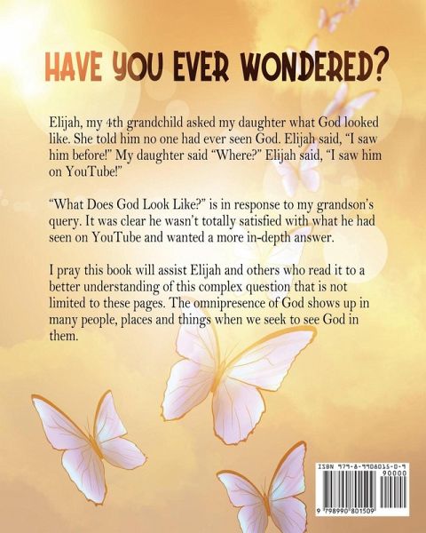 Elijah, my 4th grandchild asked my daughter what God looked like. She told him no one had ever seen God. Elijah said, "I saw him before!" My daughter said "Where?" Elijah said, "I saw him on YouTube!" "What Does God Look Like?" is in response to my grandson's query. It was clear he wasn't totally satisfied with what he had seen on YouTube and wanted a more in-depth answer. I pray this book will assist Elijah and others who read it to a better understanding of this complex question that is not limited to these pages. The omnipresence of God shows up in many people, places and things when we seek to see God in them.
