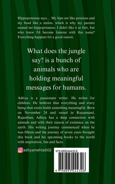 Hippopotamus says... My hips are like potatoes and my head like a melon, which is why my parents named me hippopotamus. I didn't like it at first, but who knew I'd become famous with this name? Everything happens for a good reason. What does the jungle say? is a bunch of animals who are holding meaningful messages for humans.
