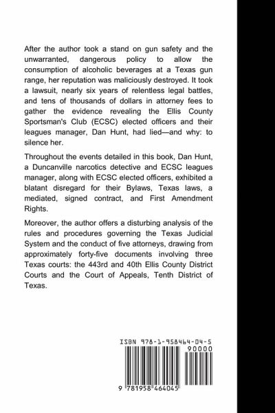 What happens when a malicious, false accusation destroys a person's reputation and credibility? Find out how one woman, through nearly five years of unwarranted and damaging litigation, fought back to clear her name and expose what her accusers tried to hide-the dangers of mixing guns, alcohol, and children at a Texas gun club. Find out how a Duncanville, Texas, narcotics detective, children's shooting coach, and unqualified gun club leagues manager, unable to control his temper, misbehavior with firearms, and vindictiveness, set in motion a series of events exposing a pattern of unprincipled conduct by the leadership of a Texas gun club, Ellis County Sportsmans Club, ECSC. Find out how an ECSC clandestine kangaroo court led by a former Cedar Hill, Texas, mayor and Doctor of Veterinary Medicine denied the author her right to defend herself. Find out how the ECSC Board of Directors' contempt for paid membership rights, Texas laws, a legal contract, and First Amendment Rights emerged when ECSC leadership attempted to stop the author from speaking out about the dangers of mixing guns, alcohol, and children at the gun club. Find out why an elected ECSC officer, the Grand Poobah, espoused his warped sense of the gun club's mission: Fostering Good Fellowship.Find out why the author came to view the ECSC as The Wild West of the Clay Shooting Sports.