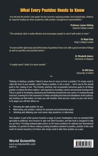 Thinking of starting a postdoc? Want to know how to move on from a postdoc? Or simply want to make the best of your postdoc years? Being a postdoc is not a career ... but it can be the pivotal point in the making of one. This friendly, practical, and occasionally humorous guide to all things postdoc combines the three authors’ vast experience of postdoc careers and personal development. This is a guide to developing, advancing and furthering yourself and your career. In working through exercises, learning from the experience of others (including the trials and tribulations of the authors), and seeking out information, we hope you will consider what success means on your own terms. In its pages you will find advice on: Choosing the right postdoc for you Maximising your postdoc contract for personal and professional goals Selecting and attaining your next career step (academic or otherwise) Your postdoc is part of the journey towards a range of career destinations; from an industrial R&D specialist to politician, from lecturer to spin-out Chief Executive, and this book is designed to help you get there. Providing indispensable advice on UK-based postdocs for national and international students, it is perfect for those making exciting transitions (student to postdoc, postdoc to the wide world of careers beyond) or for those who simply want to take their postdoc up a gear.