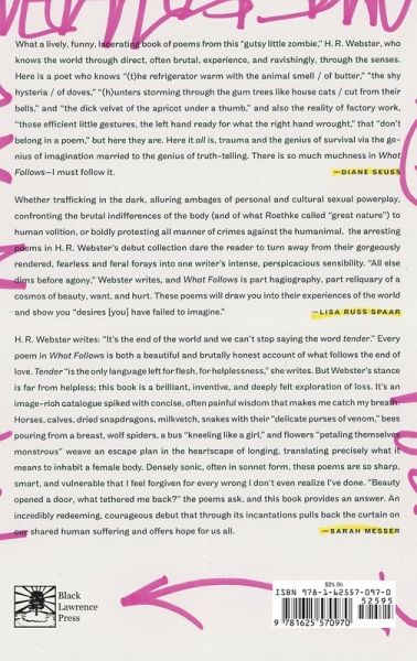 "What a lively, funny, lacerating book of poems from this "gutsy little zombie," H.R. Webster, who knows the world through direct, often brutal, experience, and ravishingly, through the senses. Here is a poet who knows "(t)he refrigerator warm with the animal smell / of butter," "the shy hysteria / of doves," "(h)unters storming through the gum trees like house cats / cut from their bells," and "the dick velvet of the apricot under a thumb," and also the reality of factory work, "those efficient little gestures, the left hand ready for what the right hand wrought," that "don't belong in a poem," but here they are. Here it all is, trauma and the genius of survival via the genius of imagination married to the genius of truth-telling. There is so much muchness in What Follows-I must follow it." --Diane Seuss, author of frank: sonnets "Whether trafficking in the dark, alluring ambages of personal and cultural sexual powerplay, confronting the brutal indifferences of the body (and of what Roethke called "great nature") to human volition, or boldly protesting all manner of crimes against the humanimal, the arresting poems in H.R. Webster's debut collection dare the reader to turn away from their gorgeously rendered, fearless and feral forays into one writer's intense, perspicacious sensibility. "All else dims before agony," Webster writes, and What Follows is part hagiography, part reliquary of a cosmos of beauty, want, and hurt. These poems will draw you into their experiences of the world and show you "desires [you] have failed to imagine." --Lisa Russ Spaar, author of Madrigalia: New & Selected Poems "H.R. Webster writes: "It's the end of the world and we can't stop saying the word tender." Every poem in What Follows is both a beautiful and brutally honest account of what follows the end of love. Tender "is the only language left for flesh, for helplessness," she writes. But Webster's stance is far from helpless; this book is a brilliant, inventive, and deeply felt exploration of loss. It's an image-rich catalogue spiked with concise, often painful wisdom that makes me catch my breath. Horses, calves, dried snapdragons, milkvetch, snakes with their "delicate purses of venom," bees pouring from a breast, wolf spiders, a bus "kneeling like a girl," and flowers "petaling themselves monstrous" weave an escape plan in the heartscape of longing, translating precisely what it means to inhabit a female body. Densely sonic, often in sonnet form, these poems are so sharp, smart, and vulnerable that I feel forgiven for every wrong I don't even realize I've done. "Beauty opened a door, what tethered me back?" the poems ask, and this book provides an answer. An incredibly redeeming, courageous debut that through its incantations pulls back the curtain on our shared human suffering and offers hope for us all." --Sarah Messer, author of Dress Made of Mice