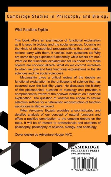 This 2001 book offers an examination of functional explanation as it is used in biology and the social sciences, and focuses on the kinds of philosophical presuppositions that such explanations carry with them. It tackles such questions as: why are some things explained functionally while others are not? What do the functional explanations tell us about how these objects are conceptualized? What do we commit ourselves to when we give and take functional explanations in the life sciences and the social sciences? McLaughlin gives a critical review of the debate on functional explanation in the philosophy of science. He discusses the history of the philosophical question of teleology, and provides a comprehensive review of the post-war literature on functional explanation. What Functions Explain provides a sophisticated and detailed Aristotelian analysis of our concept of natural functions, and offers a positive contribution to the ongoing debate on the topic.
