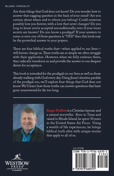 Are there things that God does not know? Do you wonder how to answer that nagging question in the back of your mind? Are you curious about where and to whom you belong? Could someone possibly love you forever, with a love that never changes? Do you long to know you're accepted unconditionally, even if your inner secrets are known? Do you know a prodigal? If your answers to some or even one of those questions is "YES!" then this book may be the proverbial answer to your prayers. There are four biblical truths that-when applied to our lives-will forever change us. These truths are so simple we often struggle with their application. However, when we fully embrace them, they radically transform us and provide the answer to our deepest desire for acceptance. This book is intended for the prodigals in our lives as well as those already walking with God every day. Using Jesus's timeless parable of the prodigal son, we'll explore four things that God does not know. We'll learn how those truths can answer questions that have gone unanswered for far too long.
