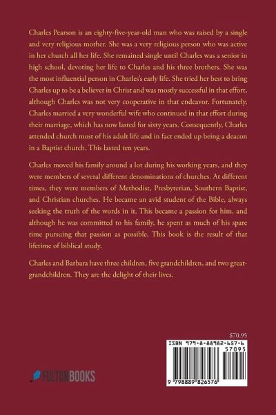 Charles Pearson is an eighty-five-year-old man who was raised by a single and very religious mother. She was a very religious person who was active in her church all her life. She remained single until Charles was a senior in high school, devoting her life to Charles and his three brothers. She was the most influential person in Charles's early life. She tried her best to bring Charles up to be a believer in Christ and was mostly successful in that effort, although Charles was not very cooperative in that endeavor. Fortunately, Charles married a very wonderful wife who continued in that effort during their marriage, which has now lasted for sixty years. Consequently, Charles attended church most of his adult life and in fact ended up being a deacon in a Baptist church. This lasted ten years. Charles moved his family around a lot during his working years, and they were members of several different denominations of churches. At different times, they were members of Methodist, Presbyterian, Southern Baptist, and Christian churches. He became an avid student of the Bible, always seeking the truth of the words in it. This became a passion for him, and although he was committed to his family, he spent as much of his spare time pursuing that passion as possible. This book is the result of that lifetime of biblical study. Charles and Barbara have three children, five grandchildren, and two great-grandchildren. They are the delight of their lives.