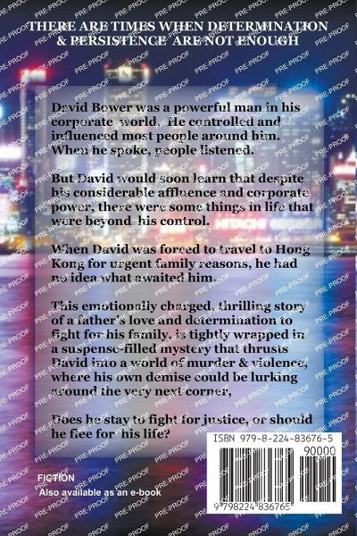 There are times when determination and perserverence are not enough... David Bower was a powerful man in his corporate world. He controlled and influenced most people around him. When he spoke, people listened. But David would soon learn that despite his considerable affluence and corporate power, there were some things in life that were beyond his control. When David was forced to travel to Hong Kong for urgent family reasons he had no idea what awaited him. This emotionally charged, thrilling story of a father's love and determination to fight for his family is tightly wrapped in a suspense- filled mystery that unwittingly thrusts David into a world of murder and violence, where his own demise could be lurking around the very next corner. Does he stay to fight for justice, or should he flee for his life?