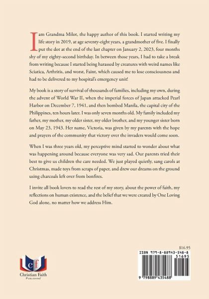 I am Grandma Milot, the happy author of this book. I started writing my life story in 2019, at age seventy-eight years, a grandmother of five. I finally put the dot at the end of the last chapter on January 2, 2023, four months shy of my eighty-second birthday. In between those years, I had to take a break from writing because I started being harassed by creatures with weird names like Sciatica, Arthritis, and worst, Faint, which caused me to lose consciousness and had to be delivered to my hospital's emergency unit! My book is a story of survival of thousands of families, including my own, during the advent of World War II, when the imperial forces of Japan attacked Pearl Harbor on December 7, 1941, and then bombed Manila, the capital city of the Philippines, ten hours later. I was only seven months old. My family included my father, my mother, my older sister, my older brother, and my younger sister born on May 23, 1943. Her name, Victoria, was given by my parents with the hope and prayers of the community that victory over the invaders would come soon. When I was three years old, my perceptive mind started to wonder about what was happening around because everyone was very sad. Our parents tried their best to give us children the care needed. We just played quietly, sang carols at Christmas, made toys from scraps of paper, and drew our dreams on the ground using charcoals left over from bonfires. I invite all book lovers to read the rest of my story, about the power of faith, my reflections on human existence, and the belief that we were created by One Loving God alone, no matter how we address Him.