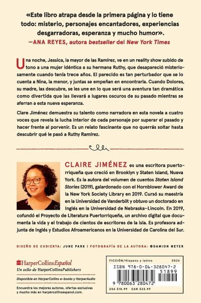 CLAIRE JIMÉNEZ es una escritora puertorriqueña que creció en Brooklyn y Staten Island, Nueva York. Es autora de la colección de cuentos Staten Island Stories (Johns Hopkins Press, 2019), galardonada con el Hornblower Award de la New York Society Library en 2019. Fue finalista de los International Latino Book Awards, Libro Favorito de la Biblioteca Pública de Nueva York sobre Nueva York y Mejor Libro Latino de 2019 por NBC News. Cursó su maestría en la Universidad de Vanderbilt y obtuvo un Doctorado en Inglés, con especialización en Estudios Étnicos y Humanidades Digitales, en la Universidad de Nebraska-Lincoln. En 2019 cofundó el Proyecto de Literatura Puertorriqueña, un archivo digital que documenta la vida y el trabajo de cientos de escritores puertorriqueños. Es profesora adjunta de Inglés y Estudios Afroamericanos en la Universidad de Carolina del Sur. Sus ficciones, ensayos y reseñas han aparecido en Remezcla, Afro-Hispanic Review, PANK, The Rumpus y Eater, entre otras publicaciones. ¿Qué le pasó a Ruthy Ramírez? es su primera novela.