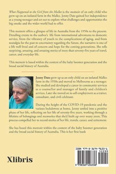 What Happened to the Girl from the Mallee is the memoir of an only child who grew up on an isolated farm in the Mallee. Jenny Date gained her independence as a young teenager and set out to explore what challenges and opportunities the big smoke and the wider world had to offer. This memoir offers a glimpse of life in Australia from the 1950s to the present. Detailing events in the author's life from international adventures to domestic service, from the vibrancy of youth to the complications of aging, and from nostalgia for the past to uncertainty regarding the future, the narrative is one of a life well lived and of concern and hope for the coming generations. She tells surprising, amazing, and amusing stories of more than seventy-five years of travel, career, and everyday life. This memoir is based within the context of the baby boomer generation and the broad social history of Australia.