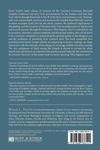 Bruce Taylor's latest volume of sermons for the Common Lectionary (Revised) compiles traditional and story form proclamations for the Sundays and feast days from Advent through Eastertide in Year B of the three-year lectionary cycle. Theologically rich, sacramentally sensitive, and ecumenically minded, these biblically centered sermons articulate God's love for the whole creation, the profound implications of discipleship, and the necessity of Christian unity. Like its predecessors in Taylor's first and second journeys through the lectionary, What Happens Next? is intended for use by preachers, educators, seminary students, and devotional readers, who will all find it to be a welcome companion in penetrating the spiritual genius of the liturgical year and the usefulness of preaching from common texts. The book exemplifies how preaching from Mark's Gospel and the accompanying lectionary readings can shape interaction with the elements of the liturgy to encourage faithful Christian worship. The very uniqueness of Mark among the Gospels is elicited to prompt the whole church and each believer to respond to the question posed implicitly but insistently by the women's discovery of the empty tomb on Easter morning: What happens next?