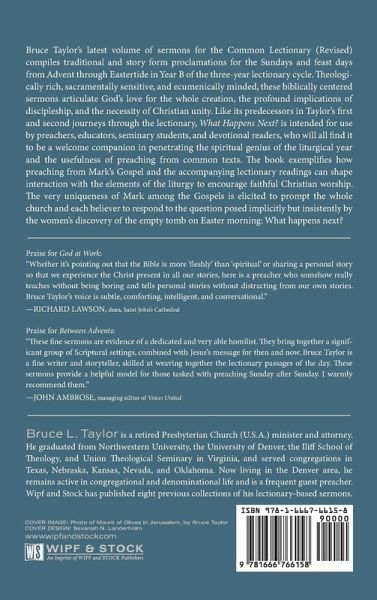 Bruce Taylor's latest volume of sermons for the Common Lectionary (Revised) compiles traditional and story form proclamations for the Sundays and feast days from Advent through Eastertide in Year B of the three-year lectionary cycle. Theologically rich, sacramentally sensitive, and ecumenically minded, these biblically centered sermons articulate God's love for the whole creation, the profound implications of discipleship, and the necessity of Christian unity. Like its predecessors in Taylor's first and second journeys through the lectionary, What Happens Next? is intended for use by preachers, educators, seminary students, and devotional readers, who will all find it to be a welcome companion in penetrating the spiritual genius of the liturgical year and the usefulness of preaching from common texts. The book exemplifies how preaching from Mark's Gospel and the accompanying lectionary readings can shape interaction with the elements of the liturgy to encourage faithful Christian worship. The very uniqueness of Mark among the Gospels is elicited to prompt the whole church and each believer to respond to the question posed implicitly but insistently by the women's discovery of the empty tomb on Easter morning: What happens next?