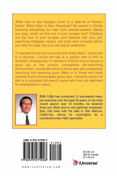 What Hue Is Your Bungee Cord? is a take-off of Richard Bolles' What Color Is Your Parachute? Be careful in blindly following everything you hear from pseudo-experts. Before you leap, check out the hue of your bungee cord! Checking out the hue of your bungee cord assures that your job-searching strategies, tactics, and tools work correctly before you take the leap into your job-search adventure. If I wanted to find out how a terrorist really feels, I would talk to a terrorist. I would not talk to a person with a PhD in terrorism. Analogously, if I wanted to find out how to secure a good job in the current, competitive job-searching environment, I would talk either to those who are successfully searching and receiving good offers or to those who have recently found and accepted good jobs. I certainly would not talk to a supposed job-search expert who has not searched for employment in years.