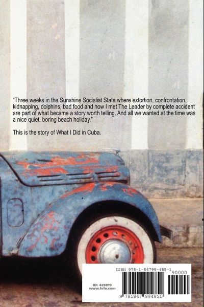 From landing in Havana, hoofing it all the way down to Trinidad and back in a rented Mexican built Nissan (with special insurance on the tyres in case they get stolen by raft builders), the author vividly describes his hellish time in the Caribbean's biggest island nation during Fidel Castro's 'Special Period'. Compared to Bill Bryson, this is a travel tale of three weeks in the Sunshine Socialist State where extortion, confrontation, dolphins, kidnapping, appalling food and a chance meeting with 'The Leader' became a story worth telling. And all the author really wanted at the time was a nice quiet, boring beach holiday. ""Surely this holiday is just off to a bad start. It couldn't get worse, could it? No really, could it?"" 2nd EDITION, REVISED FEBRUARY 2008 - MORE PAGES, MORE FUN!