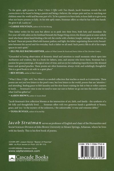 Jacob Stratman's first collection of poems, What I Have I Offer with Two Hands, offers poems where the typically mundane and forgettable become windows to the divine. Whether the speaker of these poems is transfixed by Joseph Decker's Basket of Peaches, the hills and creeks of the Ozarks, the Eucharist, his son's Batman toys in the tub, or his own childhood, the focus never leaves his relationship with his sons and their relationship with God and the created world--what he hopes for them and what he hopes for all of us. With a loose connection to the liturgical calendar, readers will follow this father's meandering path through the year as he contemplates how to love, how to hope.