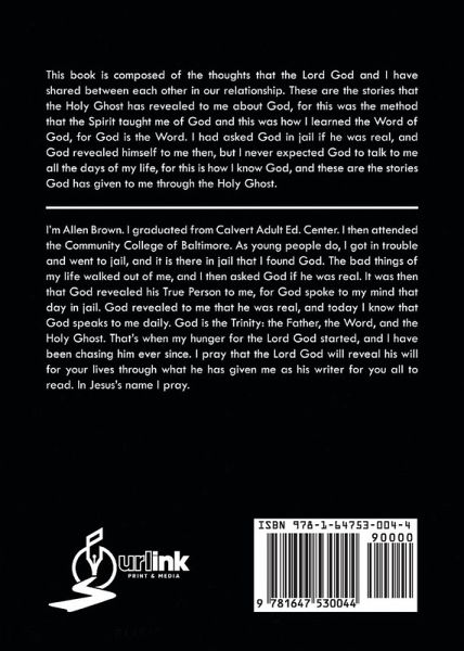 This book is composed of the thoughts that the Lord God and I have shared between each other in our relationship. These are the stories that the Holy Ghost has revealed to me about God, fot his was the method that the Spirit taught me of God and this was how I learned the Word of God, for God is the Word. I had asked God in jail if he was real, and God revealed himself to me then, but I never expected God to talk to me all the days of my life, for this is how I know God, and these are the stories God has given to me through the Holy Ghost.