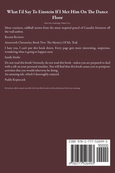 What I'd Say To Einstein If I Met Him On The Dance Floor Short Story Anthology, Volume Two: More craziness, oddball stories from the muse inspired pencil of Canada's foremost off the wall author. Recent Reviews Ainsworth Chronicles, Book Two: The Mystery Of Ms. Teak I hate you, I can't put this book down. Every page gets more interesting, suspicious, wondering what is going to happen next. Sandy Strebe Do not read this book! Seriously, do not read this book - unless you are prepared to deal with a rift on your personal timeline. You will find that this book causes you to postpone activities…mehr