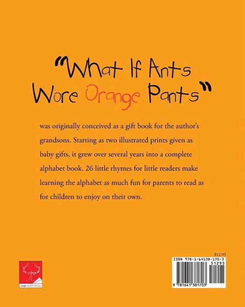 "What if Ants Wore Orange Pants" was originally conceived as a gift book for the author's grandsons. Starting as two illustrated prints given as baby gifts, it grew over several years into a complete alphabet book. 26 little rhymes for little readers make learning the alphabet as much fun for parents to read as for children to enjoy on their own.
