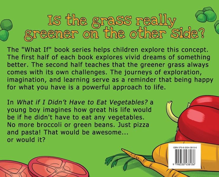 The "What If" book series helps children explore this concept. The first half of each book explores vivid dreams of something better. The second half teaches that the greener grass always comes with its own challenges. The journeys of exploration, imagination, and learning serve as a reminder that being happy for what you have is a powerful approach to life. In What if I Didn't Have to Eat Vegetables? a young boy imagines how great his life would be if he didn't have to eat any vegetables. No more broccoli or green beans. Just pizza and pasta! That would be awesome... or would it?