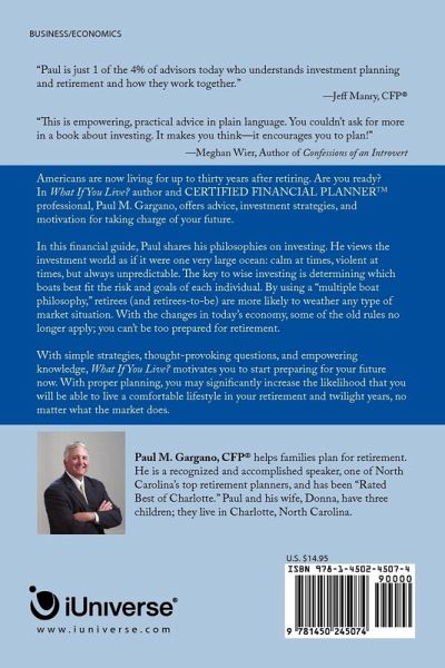 Americans are now living for up to thirty years after retiring. Are you ready? In What If You Live? author and CERTIFIED FINANCIAL PLANNERTM professional, Paul M. Gargano, offers advice, investment strategies, and motivation for taking charge of your future. In this financial guide, Paul shares his philosophies on investing. He views the investment world as if it were one very large ocean: calm at times, violent at times, but always unpredictable. The key to wise investing is determining which boats best fit the risk and goals of each individual. By using a "multiple boat philosophy," retirees (and retirees-to-be) are more likely to weather any type of market situation. With the changes in today's economy, some of the old rules no longer apply; you can't be too prepared for retirement. With simple strategies, thought-provoking questions, and empowering knowledge, What If You Live? motivates you to start preparing for your future now. With proper planning, you may significantly increase the likelihood that you will be able to live a comfortable lifestyle in your retirement and twilight years, no matter what the market does.