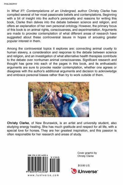 In What If?: Contemplations of an Undergrad, author Christy Clarke has compiled several of her most passionate beliefs and contemplations. Beginning with a bit of insight into the author's personality and reasons for writing this book, Clarke then delves into the debate between science and religion, and offers an explanation of her own personal ontology. However, the primary focus of this book is on animal rights, consciousness, and experimentation. Arguments are made to provoke contemplation of what different areas of research have suggested about these controversial issues in hopes of arousing greater popular interest in them. Among the controversial topics it explores are: connecting animal cruelty to human slavery, a consideration and response to the debate between science and religion, and an investigation of what alternative health therapies contribute to the debate over nonhuman animal consciousness. Significant research and thought has gone into each of the pages in this book, and its enthusiastic arguments are sure to provoke reader contemplation, whether one agrees or disagrees with the author's additional arguments and decision to acknowledge and embrace personal biases rather than try to work outside of them.