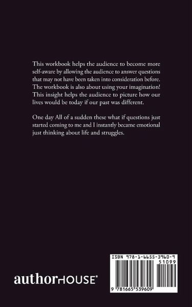 This workbook helps the audience to become more self-aware by allowing the audience to answer questions that may not have been taken into consideration before. The workbook is also about using your imagination! This insight helps the audience to picture how our lives would be today if our past was different. One day All of a sudden these what if questions just started coming to me and I instantly became emotional just thinking about life and struggles.