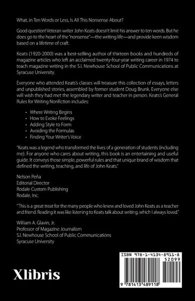 What, in Ten Words or Less, Is All This Nonsense About? Good question! Veteran writer John Keats doesn't limit his answer to ten words. But he does go to the heart of the "nonsense"-the writing life-and provide keen wisdom based on a lifetime of craft. Keats (1920-2000) was a best-selling author of thirteen books and hundreds of magazine articles who left an acclaimed twenty-four-year writing career in 1974 to teach magazine writing in the S.I. Newhouse School of Public Communications at Syracuse University. Everyone who attended Keats's classes will treasure this collection of essays, letters and unpublished stories, assembled by former student Doug Brunk. Everyone else will wish they had met the legendary writer and teacher in person. Keats's General Rules for Writing Nonfiction includes: ¿ Where Writing Begins ¿ How to Evoke Feelings ¿ Adding Style to Form ¿ Avoiding the Formulas ¿ Finding Your Writer's Voice "Keats was a legend who transformed the lives of a generation of students (including me). For anyone who cares about writing, this book is an entertaining and useful guide. It conveys those simple, powerful rules and that unique brand of wisdom that defined the writing, teaching, and life of John Keats." Nelson Peña Editorial Director Rodale Custom Publishing Rodale, Inc. "This is a great treat for the many people who knew and loved John Keats as a teacher and friend. Reading it was like listening to Keats talk about writing, which I always loved." William A. Glavin, Jr. Professor of Magazine Journalism S.I. Newhouse School of Public Communications Syracuse University
