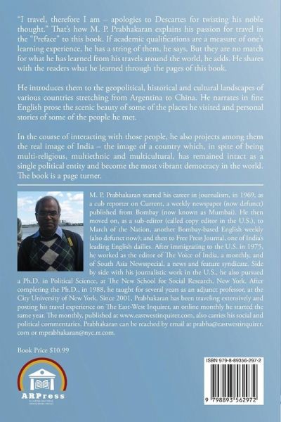 "I travel, therefore I am - apologies to Descartes for twisting his noble thought." That's how M. P. Prabhakaran explains his passion for travel in the "Preface" to this book. If academic qualifications are a measure of one's learning experience, he has a string of them, he says. But they are no match for what he has learned from his travels around the world, he adds. He shares with the readers what he learned through the pages of this book. He introduces them to the geopolitical, historical and cultural landscapes of various countries stretching from Argentina to China. He narrates in one English prose the scenic beauty of some of the places he visited and personal stories of some of the people he met. In the course of interacting with those people, he also projects among them the real image of India - the image of a country which, in spite of being multi-religious, multiethnic and multicultural, has remained intact as a single political entity and become the most vibrant democracy in the world. The book is a page turner.