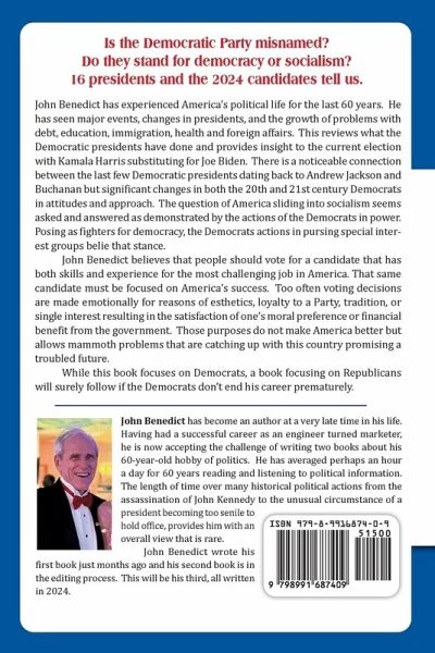 What is a Democrat reviews what the Democratic presidents have done and provides insight into the current election with Kamala Harris substituting for Joe Biden. There is a noticeable connection between the last few Democratic presidents dating back to Andrew Jackson and Buchanan, but there have been significant changes in both the 20th and 21st centuries in attitudes and approaches. The question of America sliding into socialism is questioned and demonstrated. Posing as fighters for democracy, the Democrat's actions in pursuing special interest groups belie that stance. John Benedict believes that people should vote for a candidate who has both skills and experience for the most challenging job in America. That same candidate must be focused on America's success. Too often, voting decisions are made emotionally for reasons of esthetics, loyalty to a Party, tradition, or single interest, resulting in the satisfaction of one's moral preference or financial benefit from the government. Those purposes do not make America better but allows mammoth problems that are catching up with this country, promising a troubled future.