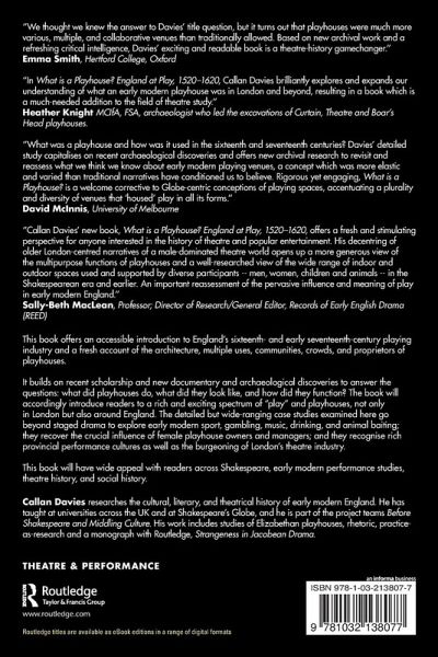 ''In What is a Playhouse? England at Play, 1520-1620, Callan Davies brilliantly explores and expands our understanding of what an early modern playhouse was in London and beyond, resulting in a book which is a much-needed addition to the field of theatre study.'' Heather Knight MCIfA, FSA, archaeologist who led the excavations of Curtain, Theatre and Boar's Head playhouses.