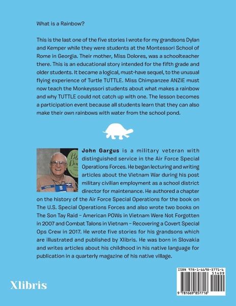 What is a Rainbow? This is the last one of the five stories I wrote for my grandsons Dylan and Kemper while they were students at the Montessori School of Rome in Georgia. Their mother, Miss Dolores, was a schoolteacher there. This is an educational story intended for the fifth grade and older students. It became a logical, must-have sequel, to the unusual flying experience of Turtle TUTTLE. Miss Chimpanzee ANZIE must now teach the Monkeyssori students about what makes a rainbow and why TUTTLE could not catch up with one. The lesson becomes a participation event because all students learn that they can also make their own rainbows with water from the school pond.