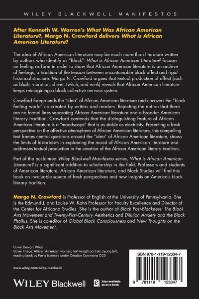 The idea of African American literature may be much more than literature written by authors who identify as "Black". What is African American Literature? focuses on feeling as form in order to show that African American literature is an archive of feelings, a tradition of the tension between uncontainable black affect and rigid historical structure. Margo N. Crawford argues that textual production of affect (such as blush, vibration, shiver, twitch, and wink) reveals that African American literature keeps reimagining a black collective nervous system.