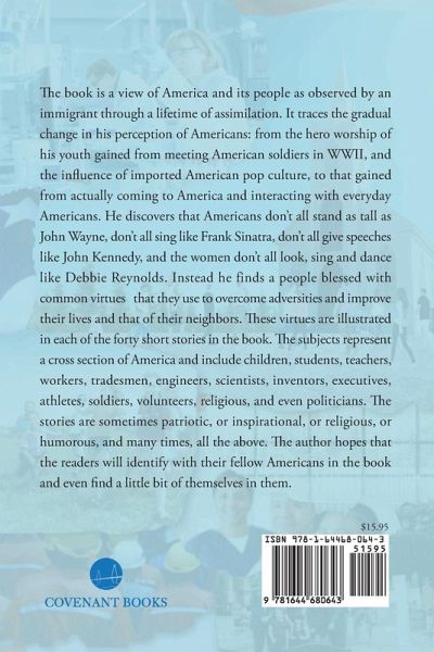 This book is a view of America and its people as observed by an immigrant through a lifetime of assimilation. It traces the gradual change in his perception of Americans: from the hero worship of his youth gained from meeting American soldiers in WWII, and the influence of imported American pop culture, to that gained from actually coming to America and interacting with everyday Americans. He discovers that Americans don’t all stand as tall as John Wayne, don’t all sing like Frank Sinatra, don’t all give speeches like John Kennedy, and the women don’t all look, sing and dance like Debbie Reynolds. Instead he finds a people blessed with common virtues that they use to overcome adversities and improve their lives and that of their neighbors. These virtues are illustrated in each of the forty short stories in the book. The subjects represent a cross section of America and include children, students, teachers, workers, tradesmen, engineers, scientists, inventors, executives, athletes, soldiers, volunteers, religious, and even politicians. The stories are sometimes patriotic, or inspirational, or religious, or humorous, and many times, all of the above. The author hopes that the readers will identify with their fellow Americans in the book and even find a little bit of themselves in them.