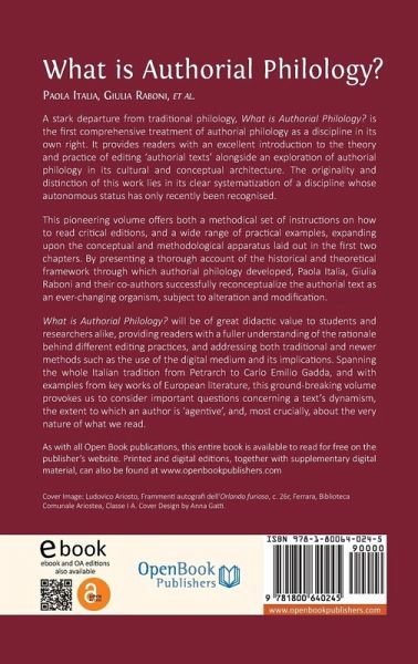 A stark departure from traditional philology, What is Authorial Philology? is the first comprehensive treatment of authorial philology as a discipline in its own right. It provides readers with an excellent introduction to the theory and practice of editing 'authorial texts' alongside an exploration of authorial philology in its cultural and conceptual architecture. The originality and distinction of this work lies in its clear systematization of a discipline whose autonomous status has only recently been recognised (at least in Italy), though its roots may extend back as far as Giorgio Pasquali. This pioneering volume offers both a methodical set of instructions on how to read critical editions, and a wide range of practical examples, expanding upon the conceptual and methodological apparatus laid out in the first two chapters. By presenting a thorough account of the historical and theoretical framework through which authorial philology developed, Paola Italia and Giulia Raboni successfully reconceptualize the authorial text as an ever-changing organism, subject to alteration and modification. What is Authorial Philology? will be of great didactic value to students and researchers alike, providing readers with a fuller understanding of the rationale behind different editing practices, and addressing both traditional and newer methods such as the use of the digital medium and its implications. Spanning the whole Italian tradition from Petrarch to Carlo Emilio Gadda, this ground-breaking volume provokes us to consider important questions concerning a text's dynamism, the extent to which an author is 'agentive', and, most crucially, about the very nature of what we read.