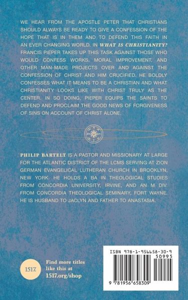 We hear from the Apostle Peter that Christians should always be ready to give a confession of the hope that is in them and to defend their faith in an ever-changing world. Originally delivered as an address at a synod convention in 1902, Das Wesen des Christentums or What is Christianity? was written by pastor and professor Francis Pieper. In What is Christianity: Faith and Morality Reconsidered, Pieper takes up Peter's task against those who would confess works, moral improvement, and other man-made projects over and against the confession of Christ and him crucified. He boldly confesses what it means to be a Christian and what Christianity looks like with Christ truly as the center. In so doing, Pieper equips the saints to defend and proclaim the good news of forgiveness of sins on account of Christ alone. Pastor Philip Bartelt (translator of Pieper's presentation) says, "For Pieper, to be Lutheran meant to believe in Jesus Christ as the perfect sacrifice for sins in our stead--that Jesus was put under the law, under our sin, and under our punishment, in our stead and on our behalf, so that by faith we may enjoy perfect freedom, righteousness, and salvation."