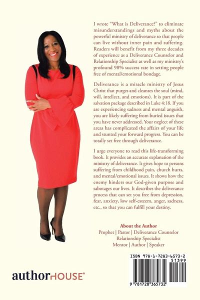I wrote "What is Deliverance?" to eliminate misunderstandings and myths about the powerful ministry of deliverance so that people can live without inner pain and suffering. Readers will benefit from my three decades of experience as a Deliverance Counselor and Relationship Specialist as well as my ministry's profound 98% success rate in setting people free of mental/emotional bondage. Deliverance is a miracle ministry of Jesus Christ that purges and cleanses the soul (mind, will, intellect, and emotions). It is part of the salvation package described in Luke 4:18. If you are experiencing sadness and mental anguish, you are likely suffering from buried issues that you have never addressed. Your neglect of these areas has complicated the affairs of your life and stunted your forward progress. You can be totally set free through deliverance. I urge everyone to read this life-transforming book. It provides an accurate explanation of the ministry of deliverance. It gives hope to persons suffering from childhood pain, church hurts, and mental/emotional issues. It shows how the enemy hinders our God-given purpose and sabotages our lives. It describes the deliverance process that can set you free from depression, fear, anxiety, low self-esteem, anger, sadness, etc., so that you can fulfill your destiny.