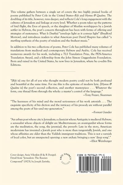 This volume is the first UK publication by Peter Cole, an acclaimed American-Israeli poet and translator. The book reprints the entire contents of his two US collections, Rift (1989) and Hymns & Qualms (1998) under one set of covers and enables a new readership to get to know a remarkable and most original voice. As US poet Forrest Gander observed: "The keenness of his mind and the moral seriousness of his work astonish .... the exquisite specificity of his diction and the intricacy of his prosody are without parallel among the poets of his - and my - generation".