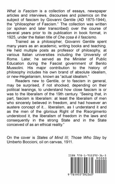 What is Fascism is a collection of essays, newspaper articles and interviews, discourses and polemics on the subject of fascism by Giovanni Gentile (AD 1875-1944), the "philosopher of Fascism." The collection was written (or spoken and later transcribed) over the course of several years prior to its publication in book format, in 1925, under the Italian title of Che cosa è il fascismo. Trained as a philosopher, Giovanni Gentile spent many years as an academic, writing books and teaching. He held multiple posts as professor of philosophy, at various Italian universities including the University of Rome. Later, he served as the Minister of Public Education during the Fascist government of Benito Mussolini. His major contribution to the history of philosophy includes his own brand of absolute idealism, or new-Hegelianism, known as "actual idealism." Readers new to Gentile, or to fascism in general, may be surprised, if not shocked, depending on their political leanings, to understand how close fascism is or was to the liberalism of the 19th century. "Seeing that, in part, fascism is liberalism: at least the liberalism of men who sincerely believed in freedom, and had however an austere concept of it... liberalism, as I understand it and as the men of the glorious Right of the Risorgimento understood it, the liberalism of freedom in the laws and consequently in the strong State and in the State conceived of as an ethical reality."