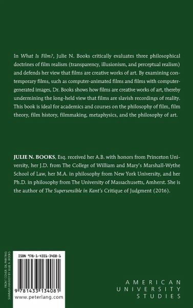 In What Is Film?, Julie N. Books critically evaluates three philosophical doctrines of film realism (transparency, illusionism, and perceptual realism) and defends her view that films are creative works of art. By examining contemporary films, such as computer-animated films and films with computer-generated images, Dr. Books shows how films are creative works of art, thereby undermining the long-held view that films are slavish recordings of reality. This book is ideal for academics and courses on the philosophy of film, film theory, film history, filmmaking, metaphysics, and the philosophy of art.