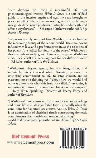 "Part daybook on living a meaningful life, part phenomenological treatise, What Is Given is a field guide to the interior. Again and again, we are brought to places and difficulties and moments of grace, and each time, a wise guide directs our eye, shows us what lies underneath, and offers a way forward."-Sebastian Matthews, author of In My Father's Footsteps "In poems acutely aware of loss, Washburn comes back to the redeeming beauty of the sensual world. These are poems infused with love and a profound trust in, as she titles one of her poems, 'the radical hospitality of the senses.' With poetry that reminds us to be grateful for what is given, Washburn establishes herself as a necessary poet for our difficult times." -Ed Falco, author of X in the Tickseed