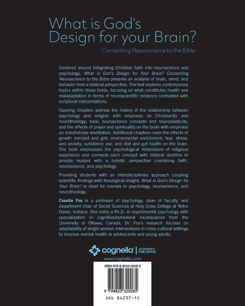 Centered around integrating Christian faith into neuroscience and psychology, What is God's Design for Your Brain? Connecting Neuroscience to the Bible presents an analysis of brain, mind, and behavior from a biblical perspective. The text explores contemporary topics within these fields, focusing on what constitutes health and maladaptation in terms of neuroscientific evidence contrasted with scriptural interpretations. Opening chapters address the history of the relationship between psychology and religion with emphasis on Christianity and neurotheology; basic neuroscience concepts and neuroplasticity; and the effects of prayer and spirituality on the brain with emphasis on mindfulness meditation. Additional chapters cover the effects of growth mindset and grit; environmental enrichment; fear, stress, and anxiety; substance use; and diet and gut health on the brain. The book emphasizes the psychological dimensions of religious experience and connects each concept with biblical doctrine to provide readers with a holistic perspective combining faith, neuroscience, and psychology. Providing students with an interdisciplinary approach coupling scientific findings with theological insight, What is God's Design for Your Brain? is ideal for courses in psychology, neuroscience, and neurotheology.