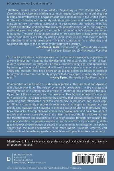 Communities are not static or stationary organisms. They are fluid and dynamic and change over time. The role of community development in the change and transformation of a community is critical to improving and enhancing the quality of life of the community and its residents. This book examines how community development changes a community and why that change matters, while also examining the relationship between community development and social capital. When a community improves its social capital, change can happen because people can leverage their networks to produce better results for themselves. This book also looks at comprehensive community development and collective impact models and several case studies that utilize these models. It also looks at how the transformation and revitalization of a neighborhood through new housing creates opportunities for people everywhere, and how effective placemaking strategies empower diverse groups of people in a community to reimagine their public spaces and the built environment to be more livable, walkable, creative, and sustainable while fostering greater connections with people in their community.