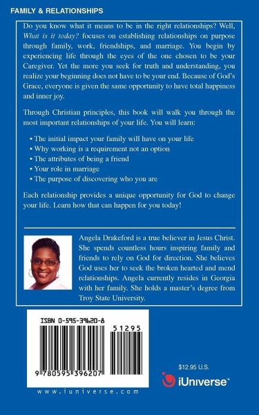 Do you know what it means to be in the right relationships? Well, What is it today? focuses on establishing relationships on purpose through family, work, friendships, and marriage. You begin by experiencing life through the eyes of the one chosen to be your Caregiver. Yet the more you seek for truth and understanding, you realize your beginning does not have to be your end. Because of God's Grace, everyone is given the same opportunity to have total happiness and inner joy. Through Christian principles, this book will walk you through the most important relationships of your life. You will learn: The initial impact your family will have on your life Why working is a requirement not an option The attributes of being a friend Your role in marriage The purpose of discovering who you are Each relationship provides a unique opportunity for God to change your life. Learn how that can happen for you today!