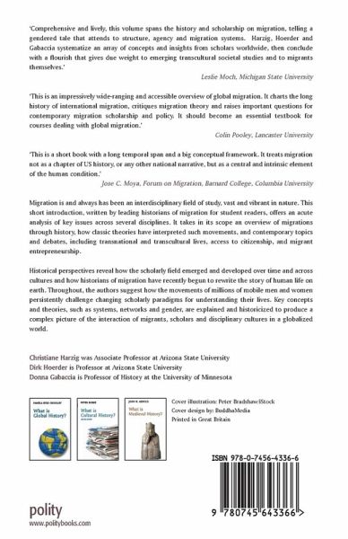 "Comprehensive and lively, this volume spans the history and scholarship on migtration, telling a gendered tale that attends to structure, agency and migration sysstems. Harzig, Hoerder and Gabaccia systematize an array of concepts and insights from scholars worldwide, then conclude with a flourish that gives due to emerging transcultural societal studies and to migrants themselves."