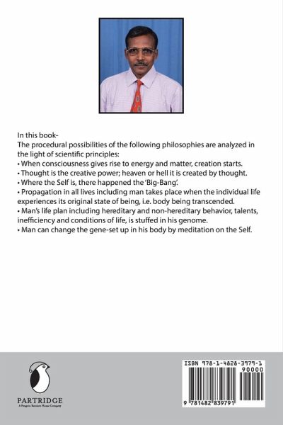 In this book- The procedural possibilities of the following philosophies are analyzed in the light of scientific principles: ¿ When consciousness gives rise to energy and matter, creation starts. ¿ Thought is the creative power; heaven or hell it is created by thought. ¿ Where the Self is, there happened the 'Big-Bang'. ¿ Propagation in all lives including man takes place when the individual life experiences its original state of being, i.e. body being transcended. ¿ Man's life plan including hereditary and non-hereditary behavior, talents, inefficiency and conditions of life, is stuffed in his genome. ¿ Man can change the gene-set up in his body by meditation on the Self.