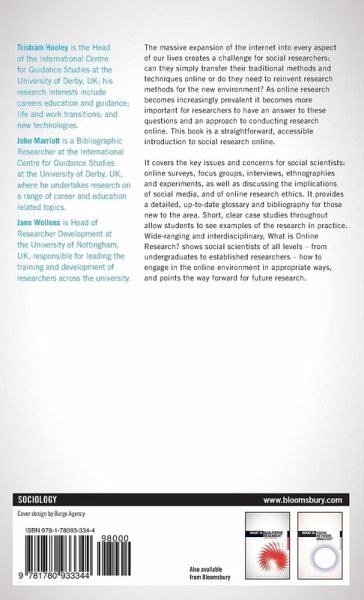 This book is available as open access through the Bloomsbury Open Access programme and is available on www.bloomsburycollections.com. The massive expansion of the internet into every aspect of our lives creates a challenge for social researchers: can they simply transfer their traditional methods and techniques online or do they need to reinvent research methods for the new environment? As online research becomes increasingly prevalent it becomes more important for researchers to have an answer to these questions and an approach to conducting research online. This book is a straightforward, accessible introduction to social research online. It covers the key issues and concerns for social scientists: online surveys, focus groups, interviews, ethnographies and experiments, as well as discussing the implications of social media, and of online research ethics. It provides a detailed, up-to-date glossary and bibliography for those new to the area. Short, clear case studies throughout allow students to see examples of the research in practice. Wide-ranging and interdisciplinary, What is Online Research? shows social scientists of all levels - from undergraduates to established researchers - how to engage in the online environment in appropriate ways, and points the way forward for future research.