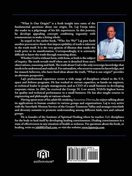 "What Is Our Origin?" is an exciting reading about some of the basic questions about our origin. Dr. Laj Utreja develops simple concepts based on his experiences gained from childhood through the adult age. With an uncommon ability he connects those concepts to make a logical whole that he calls commonsensical. In sequel to his earlier book, "Who Are We?" Laj puts forth another one of his provocative thesis that invisibility of truth is inherent in the truth itself. It is the very genesis of illusion that masks the truth prior to manifestation. Correspondingly, it is impossible to know the truth through reasoning alone. Whether God is without form, with form, or both is a subject of enquiry. The truth reveals itself when one is not attached to one's observations, reasoning, and faith and the conclusion there from concur. It is the only sovereign knowledge that needs to be understood and realized. For rationalists, who resort to reason for knowledge, and for staunch believers, who have fixed ideas about the truth, "What is our origin?" provides a piercing insight. Laj's professional experience covers a wide range of disciplines related to the U.S. space and defense programs. He has worked in various capacities, as hands-on engineer, as technical leader in people management, and as CEO of a small business in developing corporate vision. In 2001, he received the George M. Low award, NASA's highest honor for quality and technical performance to a small business. He has also taught courses in engineering and philosophy at various schools. Having spent most of his adult life studying Sanaatana Dharma, he enjoys talking about its applications as part of cross-cultural understanding to various groups and organizations. Laj is very active with the Interfaith Mission Service of the Greater Tennessee Valley and arranges interfaith and diversity summits to promote understanding among different faith, race and cultural groups. He is founder of the Institute of Spiritual Healing where he teaches certain Vedic disciplines for the body to heal itself by developing healing consciousness. Healing consciousness is a state of effectiveness in any situation of health or sickness. For enquiry about the book, or healing, write to: ish0001@aol.com, or visit the website: www.lajutreja.com