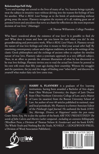 Relationships/Self-Help "Love and marriage are central to the lives of many of us. Yet, human beings typically treat the subject in intuitive ways without delving into the reasons for feelings of love for another. What is REAL Love? brings us to the brink of understanding without giving away the secret. Flannery recognizes the mystery of it all, making great use of personal letters and anecdotes that serve as a basis for reflection on the most important decision of our lives." (Marriage) -R.Thomas Williamson, College President Who hasn't wondered about the existence of true love? Is it possible to find the one? What does it mean and how can you know for sure when you do? In this groundbreaking and provocative work, What is REAL Love? Harry A. Flannery reveals the nature of true love feelings and what it means to find your actual other half. By examining contemporary culture and religious traditions, as well as the writings of the classic Greek philosophers and the etchings of ancient tribes to explore the timeless nature of true love, Flannery takes a systematic approach to a very difficult subject. Then, in an effort to provide the ultimate illustration of what he has discovered to be true love feelings, Flannery invites you to read the actual love letters he penned to his own wife more than fifty years ago during their courtship. Witness the struggles and the questions, the joy and the magic of finding your "other half," and discover for yourself what makes fairy tale love come true.