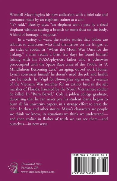Mayo begins his new collection with a brief tale and utterance made by an elephant trainer at a zoo: "It's said," Beasley says, "an elephant won't pass by a dead elephant without casting a branch or some dust on the body. A kind of homage, I suppose." In a variety of ways, the twelve stories that follow are tributes to characters who find themselves on the fringes, at the sides of roads. In "When the Moon Was Ours for the Taking," a man recalls a brief few days he found himself fishing with his NASA-physicist father who is otherwise preoccupied with the Space Race craze of the 1960s. In "A Mindfulness Becoming Less," an aging, out-of work Homer Lynch convinces himself he doesn't need the job and health care he needs. In "Vigil for Ammospiza nigréscens," a veteran of the Vietnam War searches for an extinct bird in the salt marshes of Florida, haunted by the North Vietnamese soldier he killed. In "Burn Barrel," Cole, a jobless college graduate, despairing that he can never pay his student loans, begins to burn all his university papers, in a strange effort to erase the debt. In these and other stories, Mayo's characters are people we think we know, in situations we think we understand-and then realize in flashes of truth we can see them-and ourselves-in new ways.